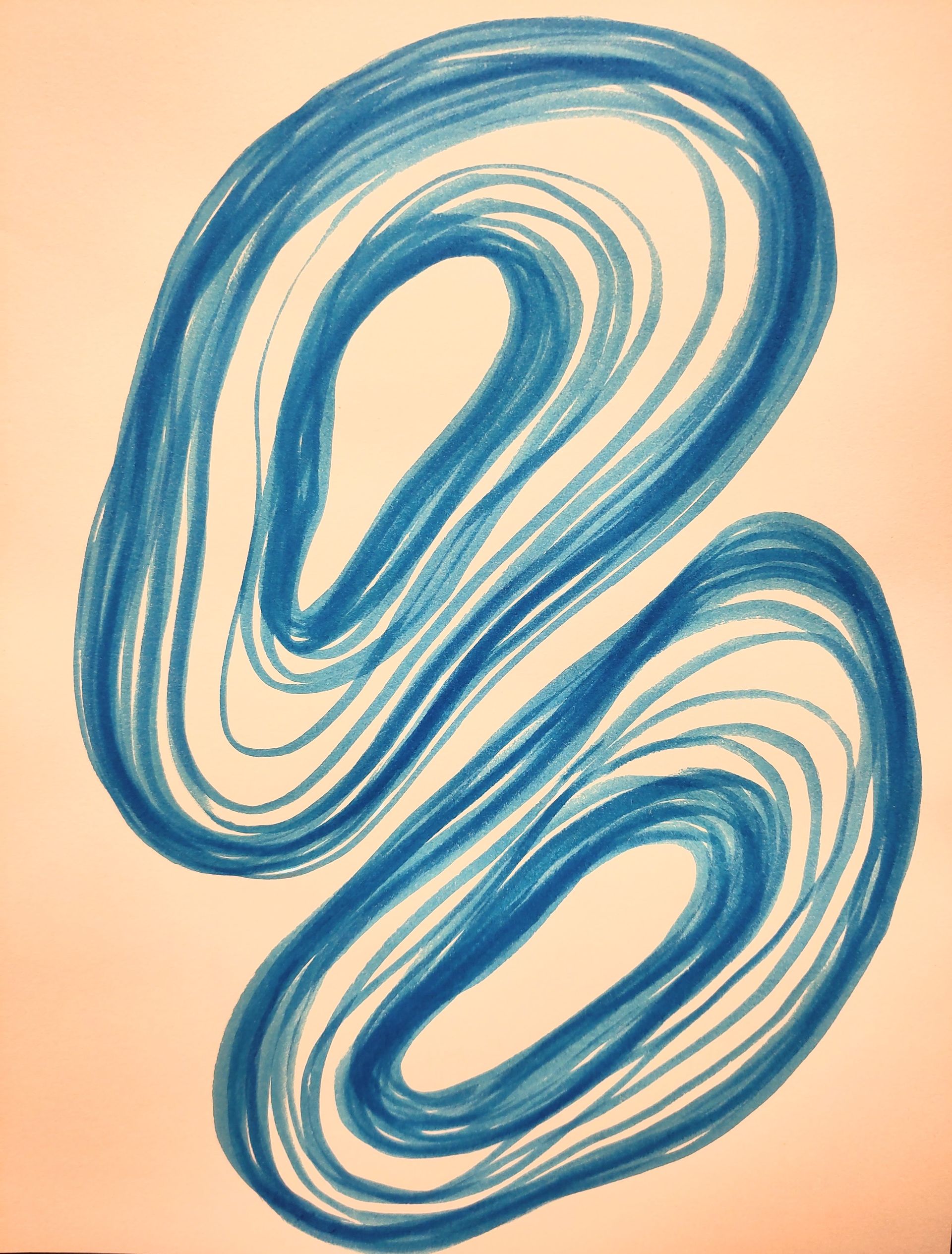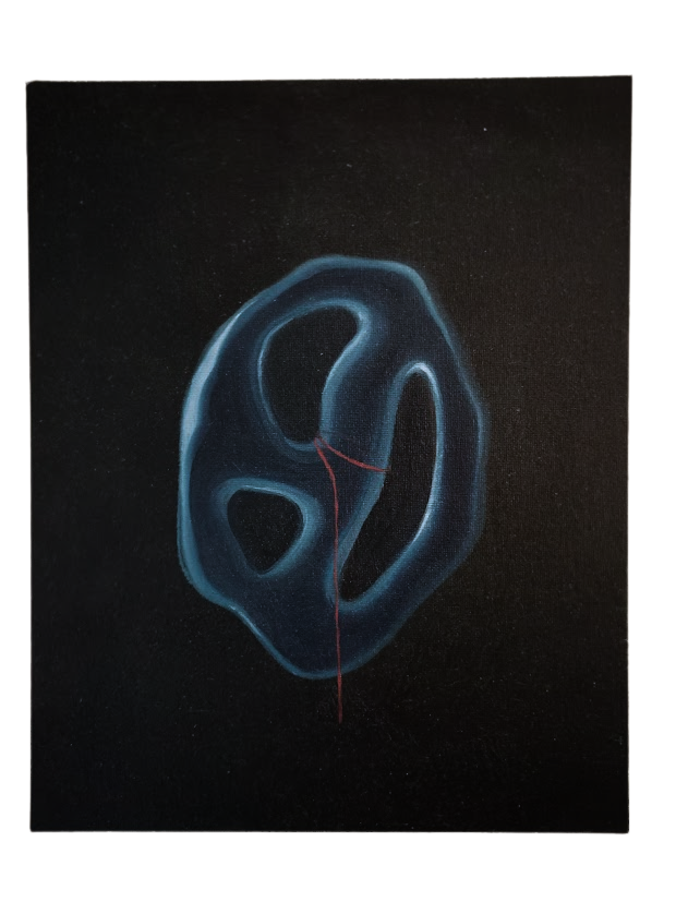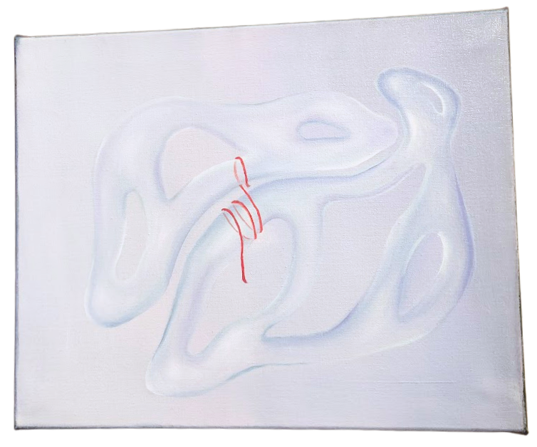 Recurring dreams and nightmares have formed this collection of paintings. Fragile forms bound by fuzzy strings of red yarn. Glass and metal. An attempt to create a sense of danger in my first ever abstract art collection.